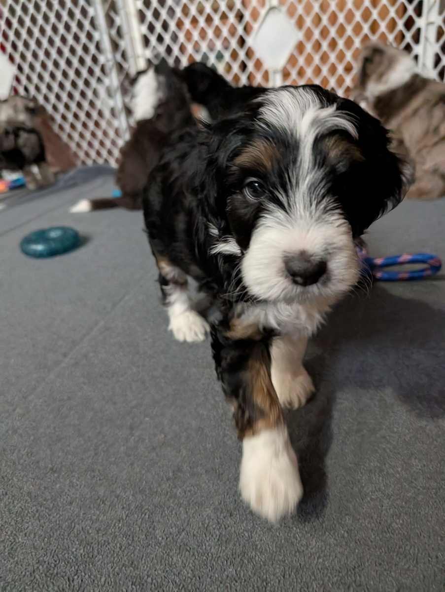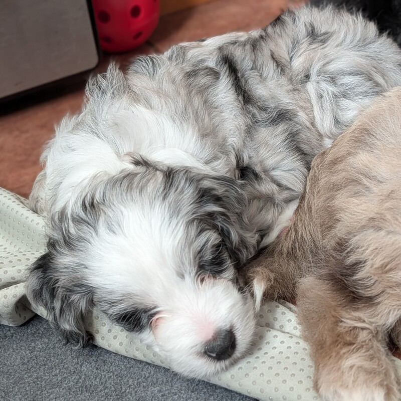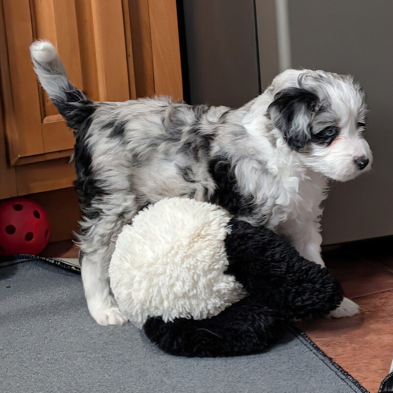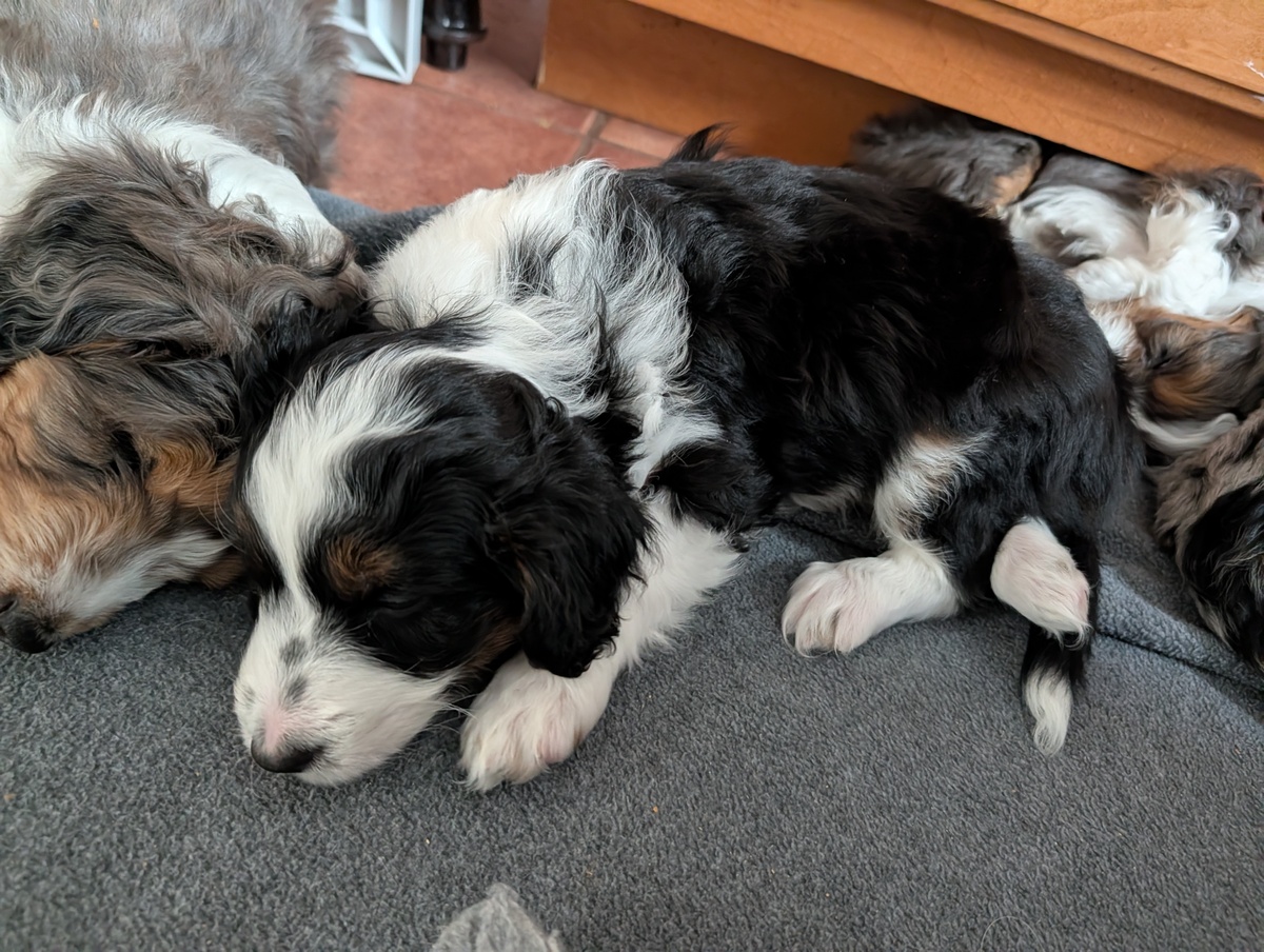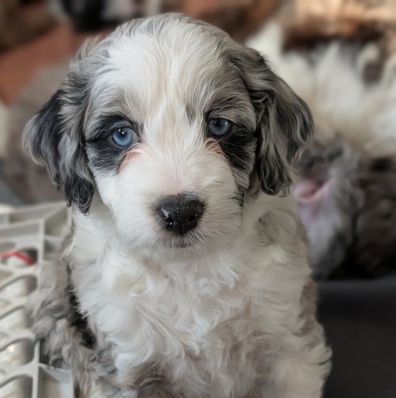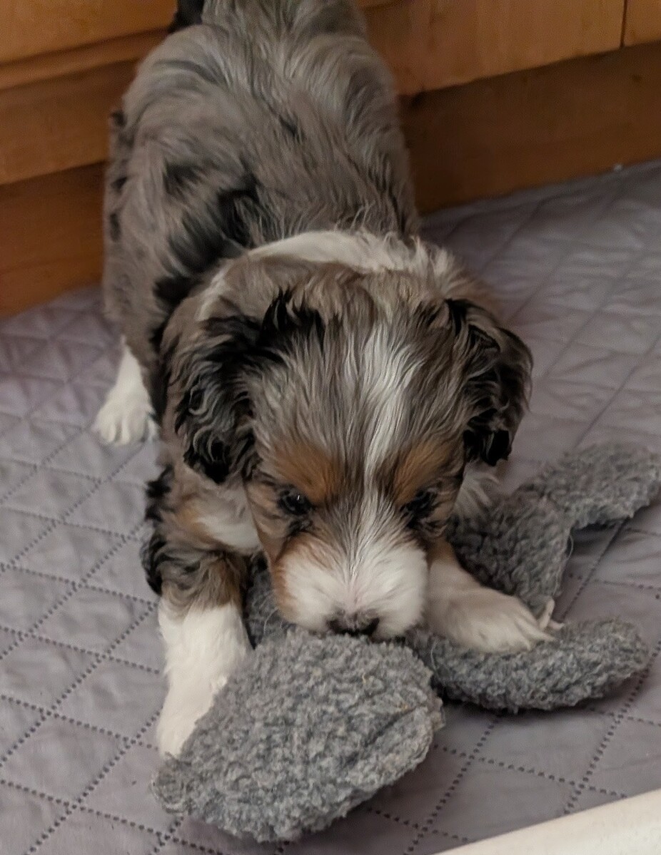 On November 24th, Sierra delivered 8 beautiful, healthy puppies. The litter consisted of 4 girls and 4 boys. Coat colors include Black Tri and variations of Blue Merle. While coat colors will vary as they get older, each puppy has their own unique markings.