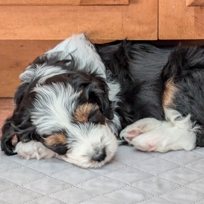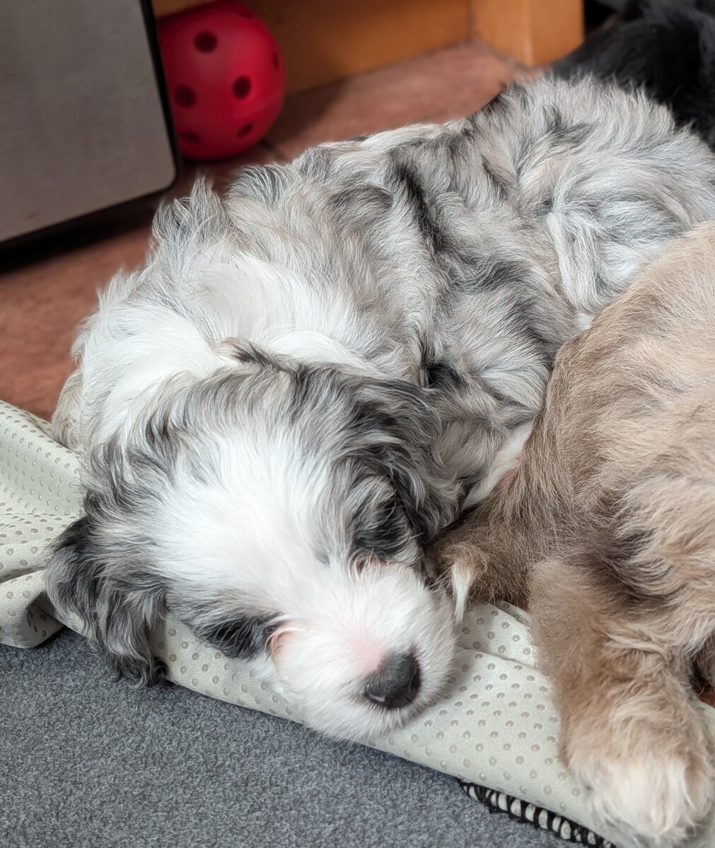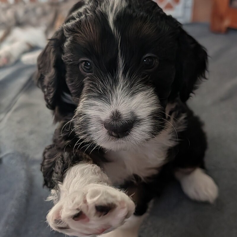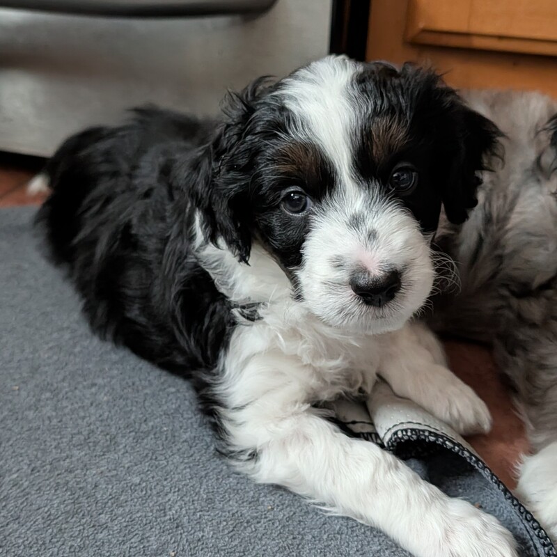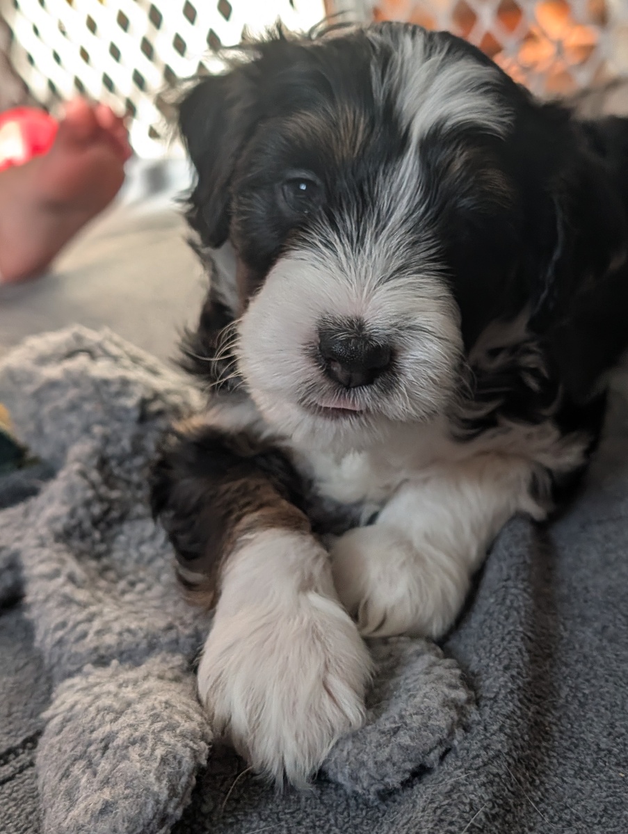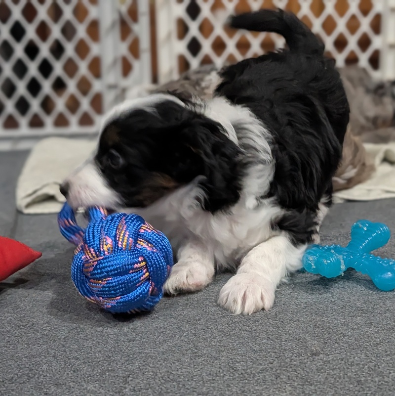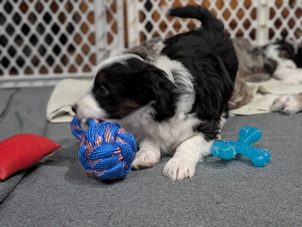 On November 24th, Sierra delivered 8 beautiful, healthy puppies. The litter consisted of 4 girls and 4 boys. Coat colors include Black Tri and variations of Blue Merle. While coat colors will vary as they get older, each puppy has their own unique markings.