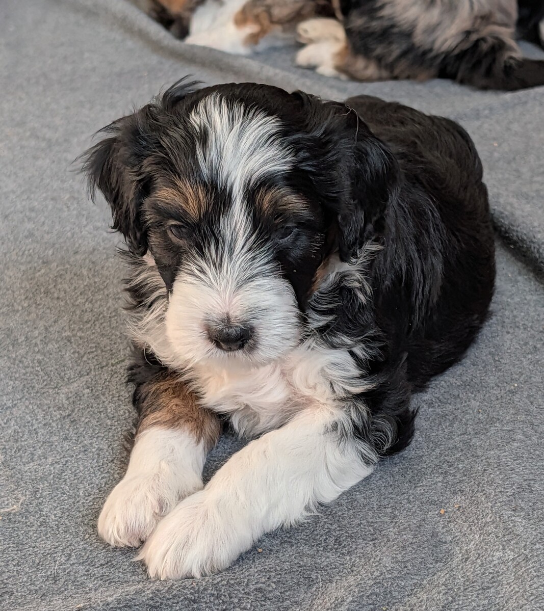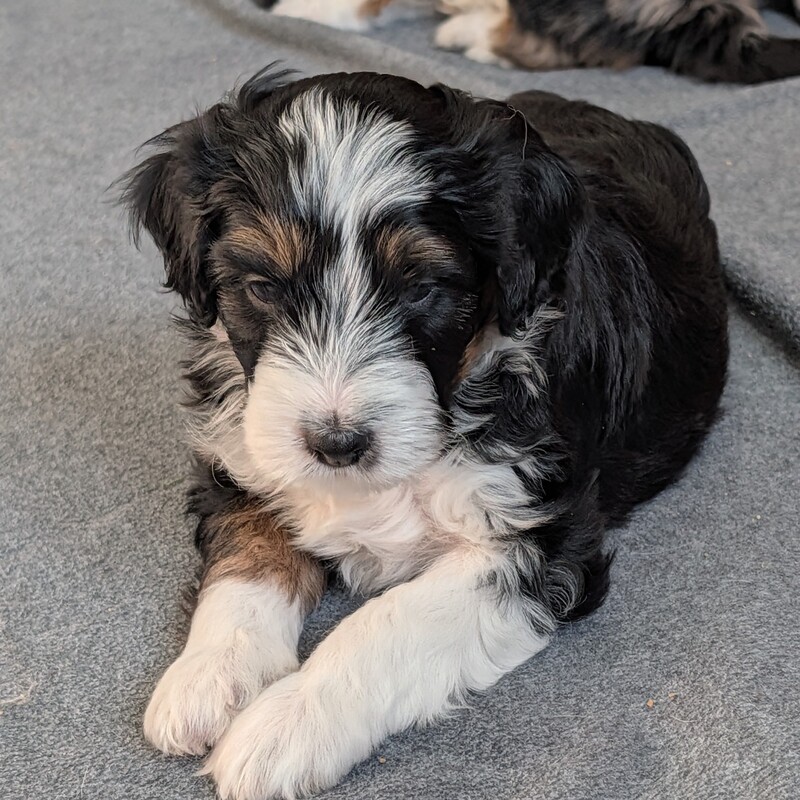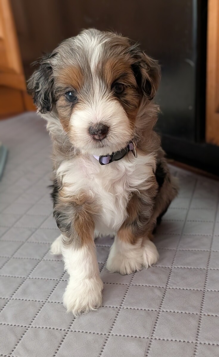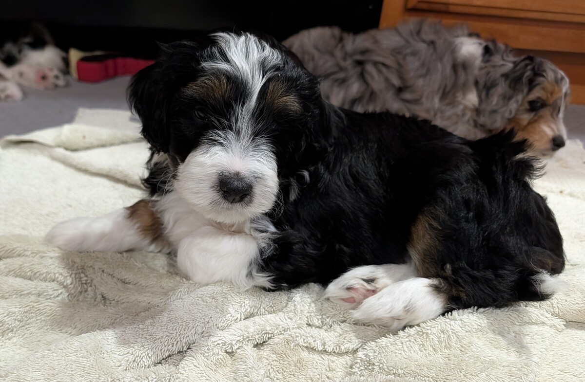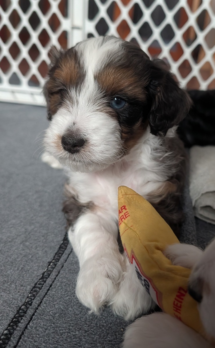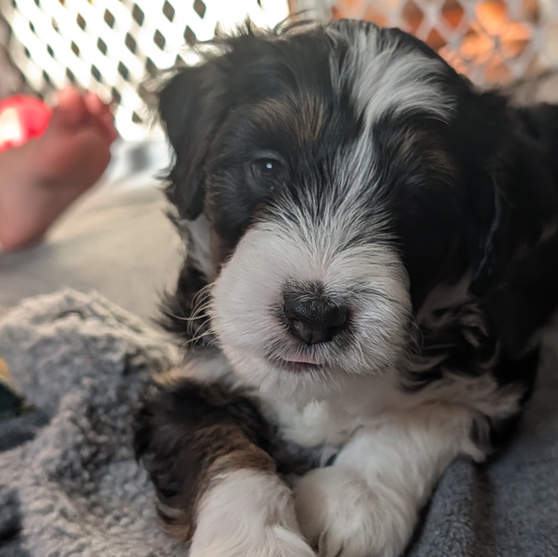 On November 24th, Sierra delivered 8 beautiful, healthy puppies. The litter consisted of 4 girls and 4 boys. Coat colors include Black Tri and variations of Blue Merle. While coat colors will vary as they get older, each puppy has their own unique markings.