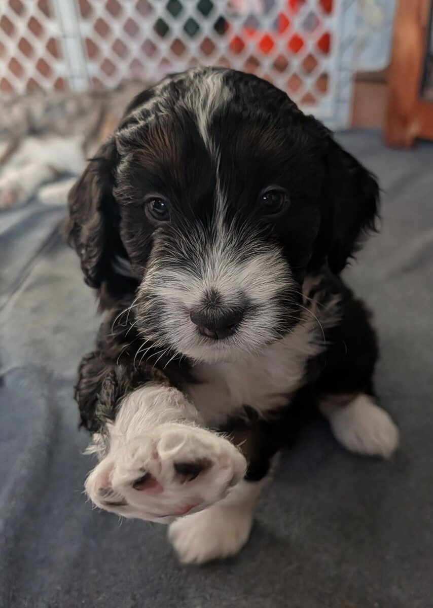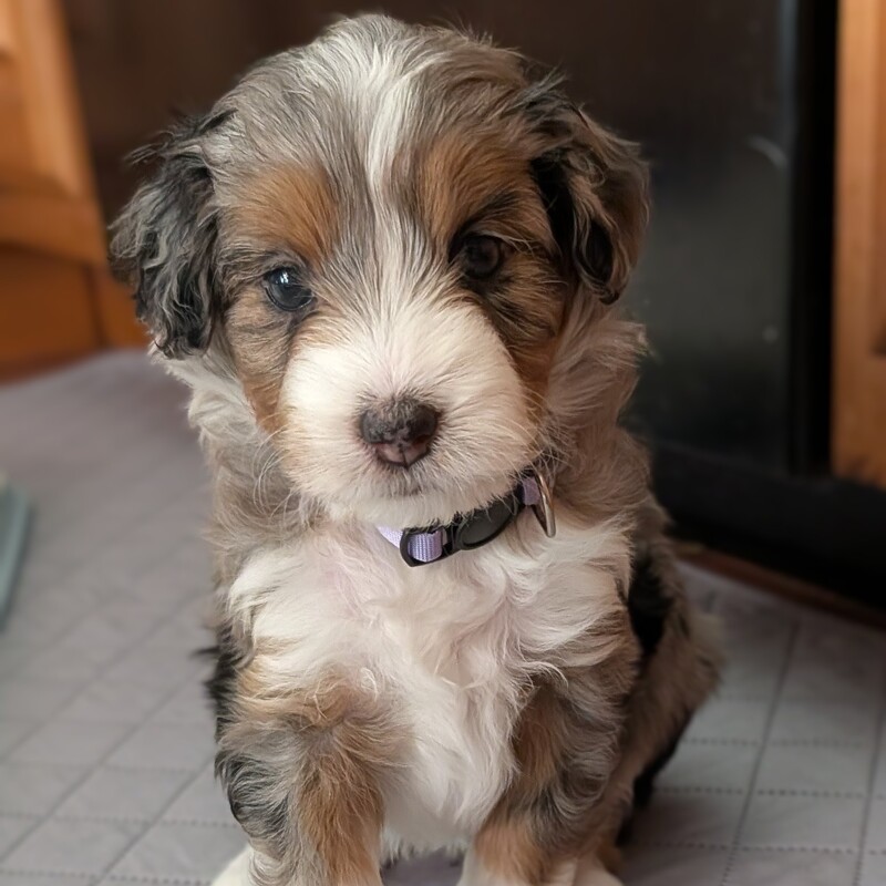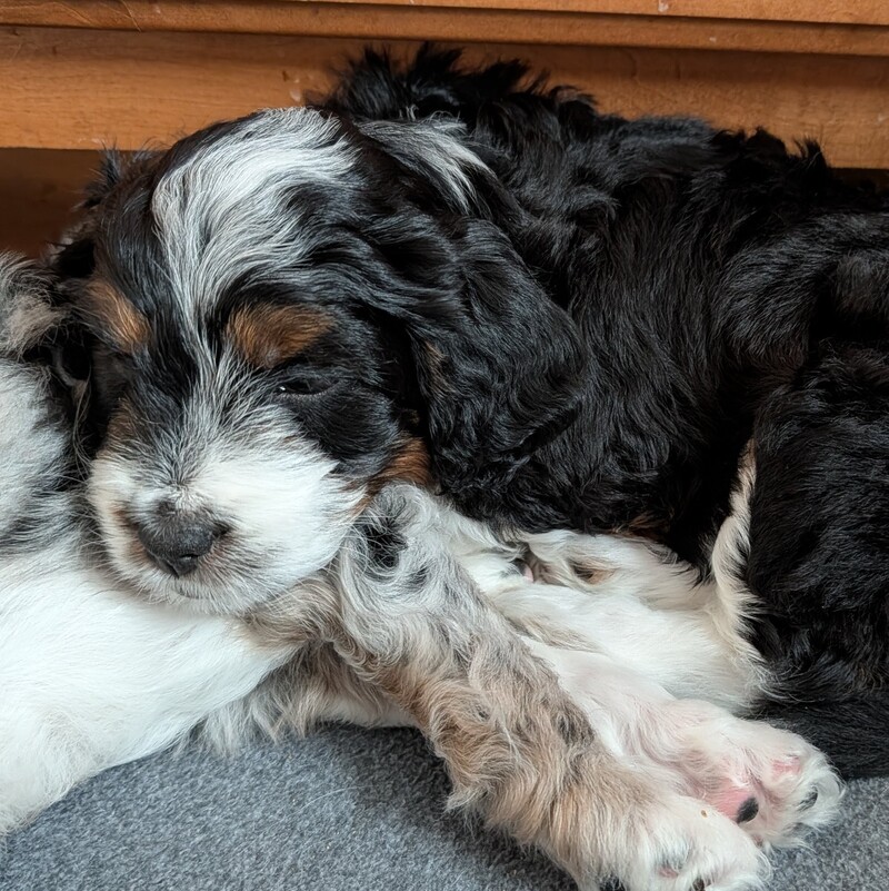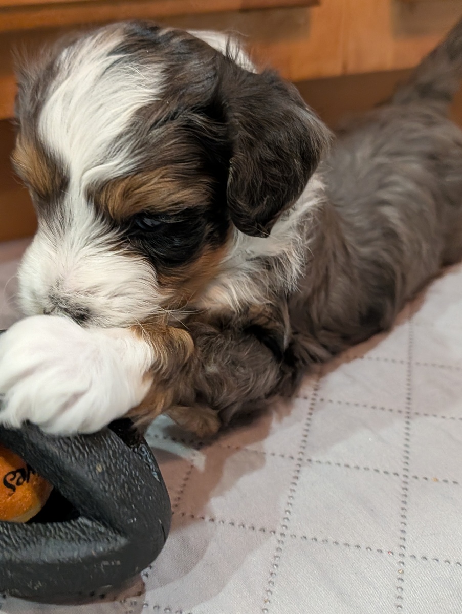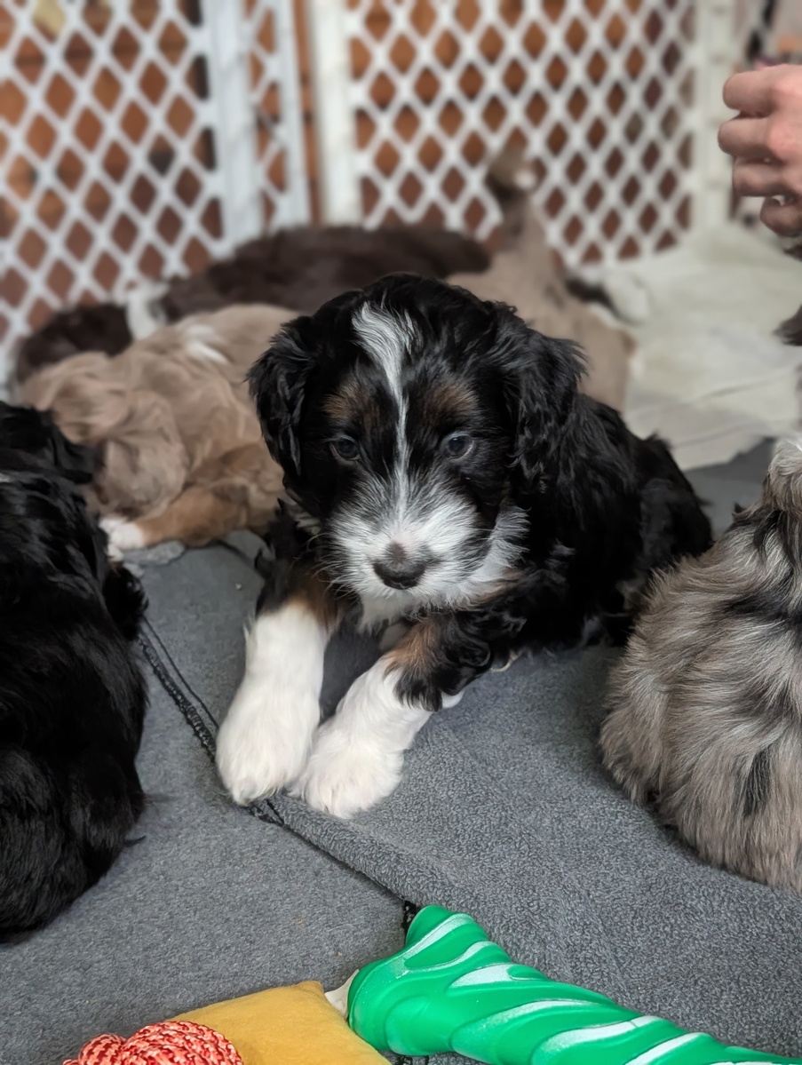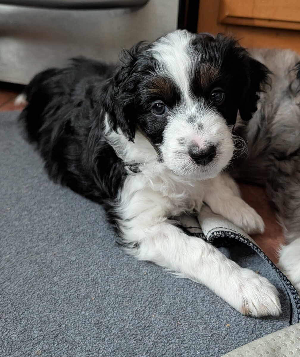 On November 24th, Sierra delivered 8 beautiful, healthy puppies. The litter consisted of 4 girls and 4 boys. Coat colors include Black Tri and variations of Blue Merle. While coat colors will vary as they get older, each puppy has their own unique markings.
