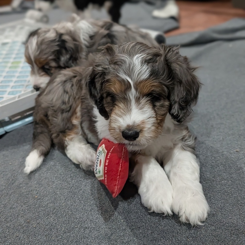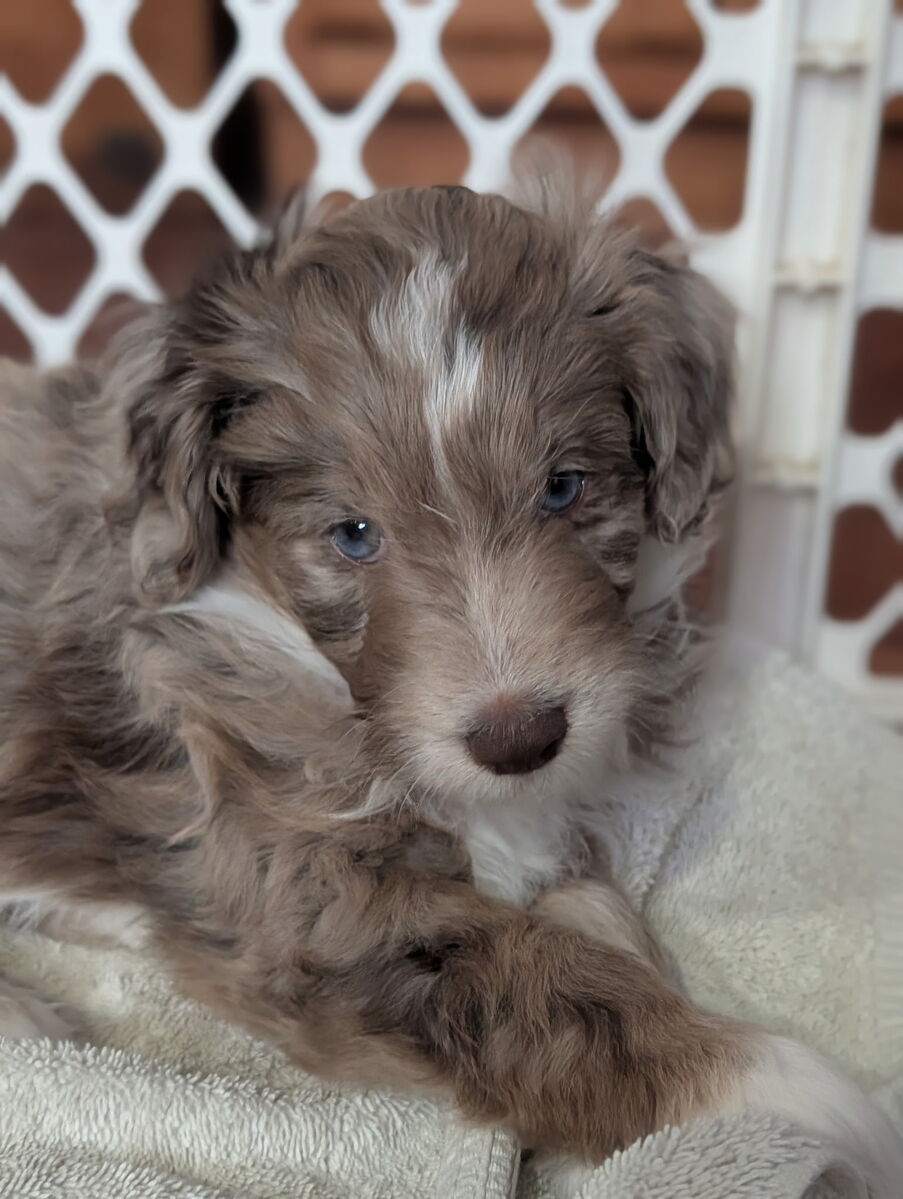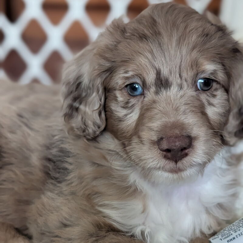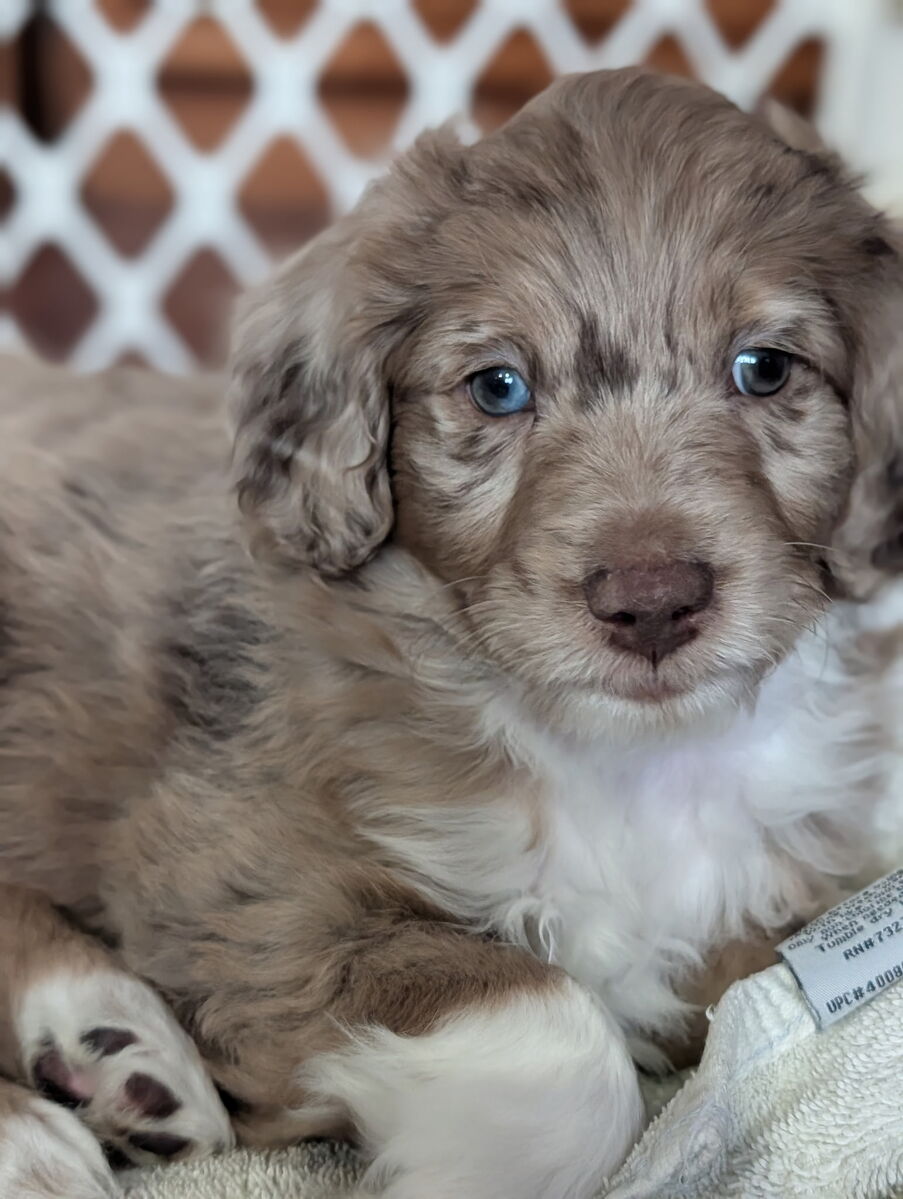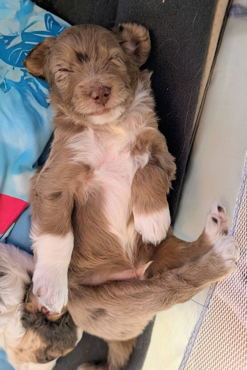 On November 20th, Flicka delivered 7 beautiful, healthy puppies. The litter consisted of 4 girls and 3 boys. Coat colors include Red Merle, Blue Merle, and Chocolate Mantle. While coat colors will vary as they get older, each puppy has their own unique markings.