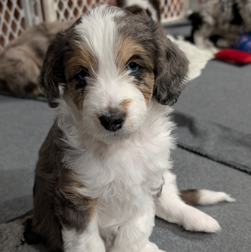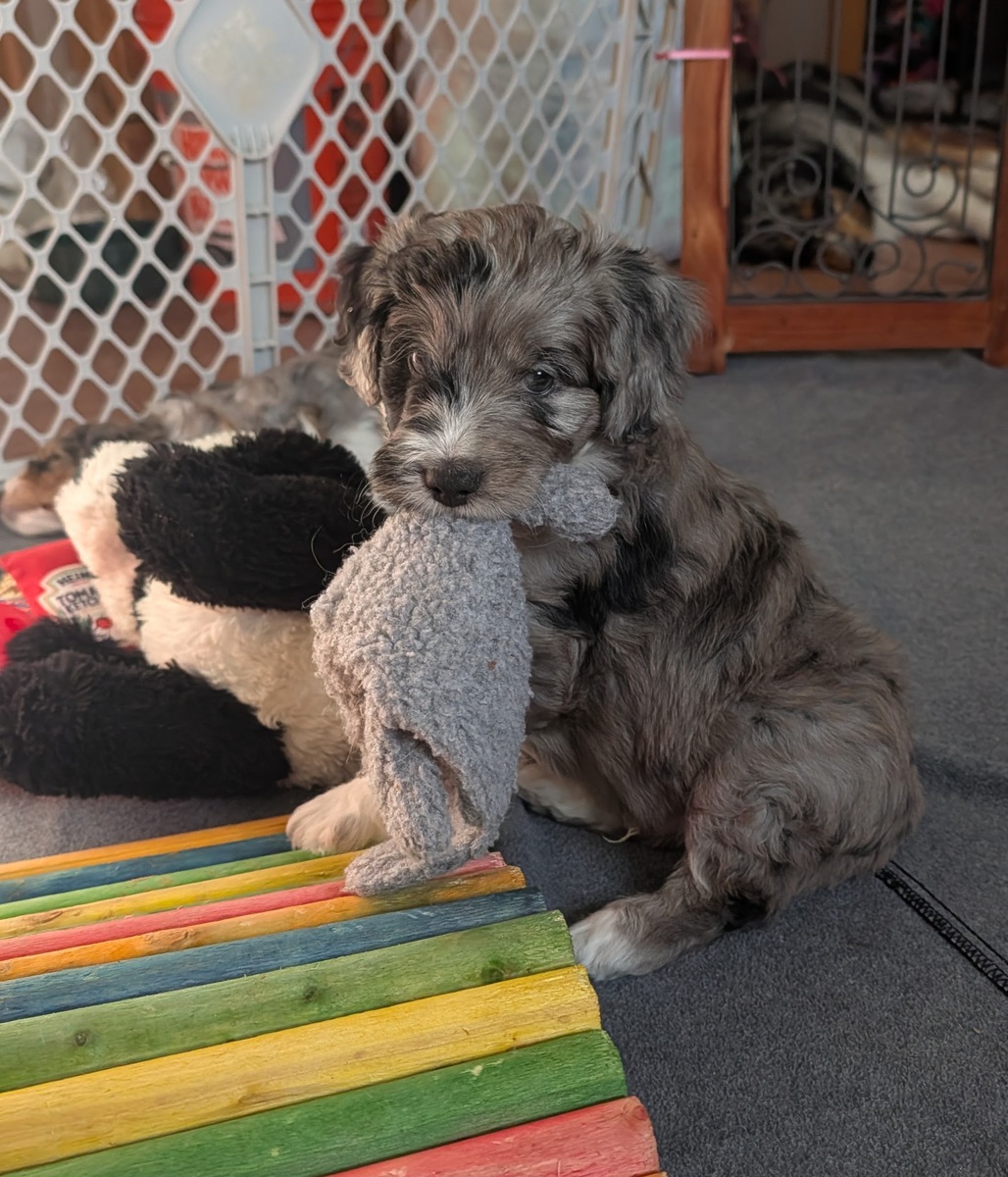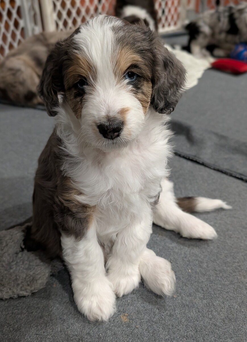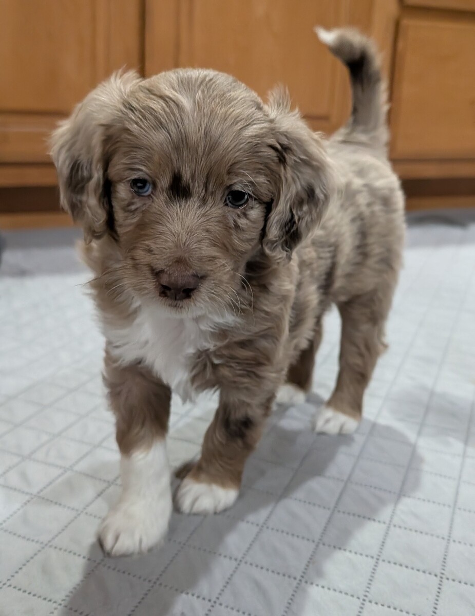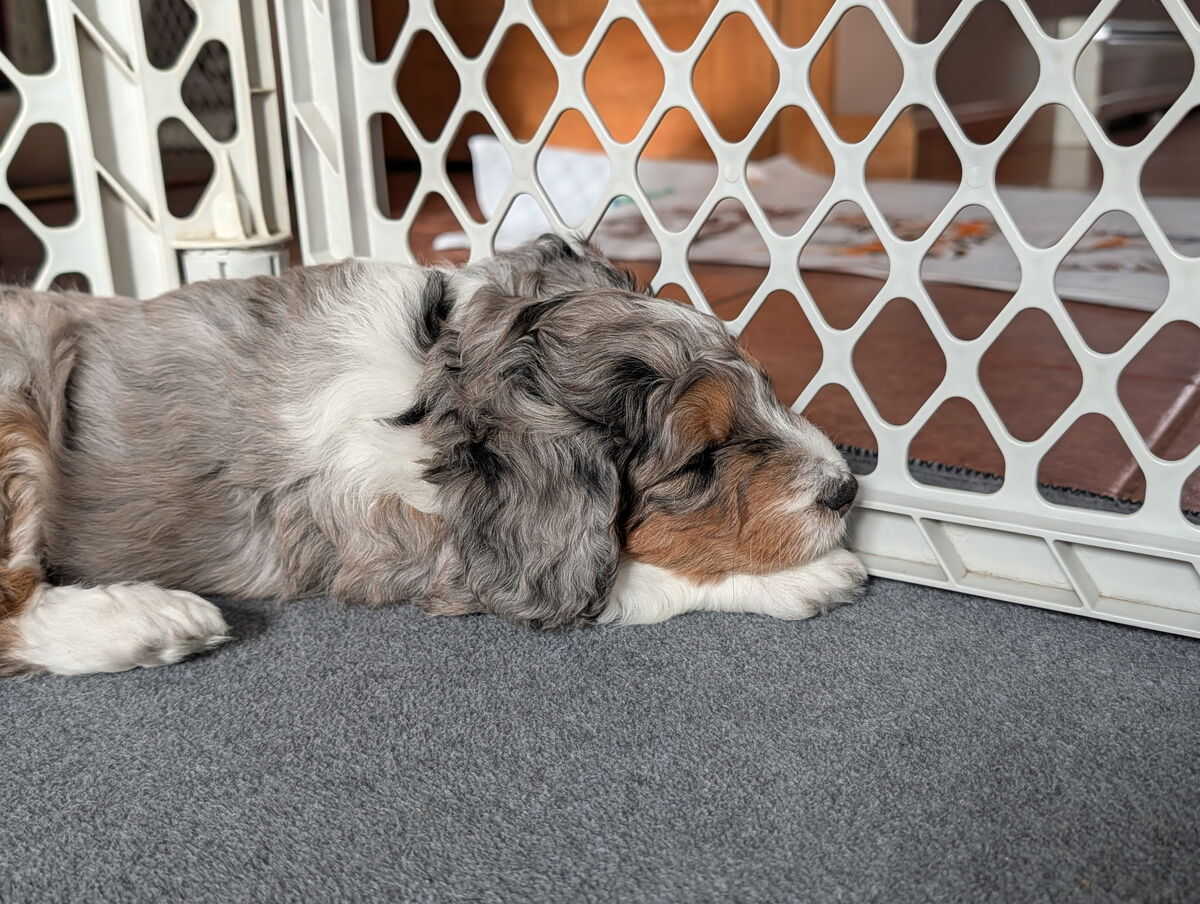 On November 20th, Flicka delivered 7 beautiful, healthy puppies. The litter consisted of 4 girls and 3 boys. Coat colors include Red Merle, Blue Merle, and Chocolate Mantle. While coat colors will vary as they get older, each puppy has their own unique markings.