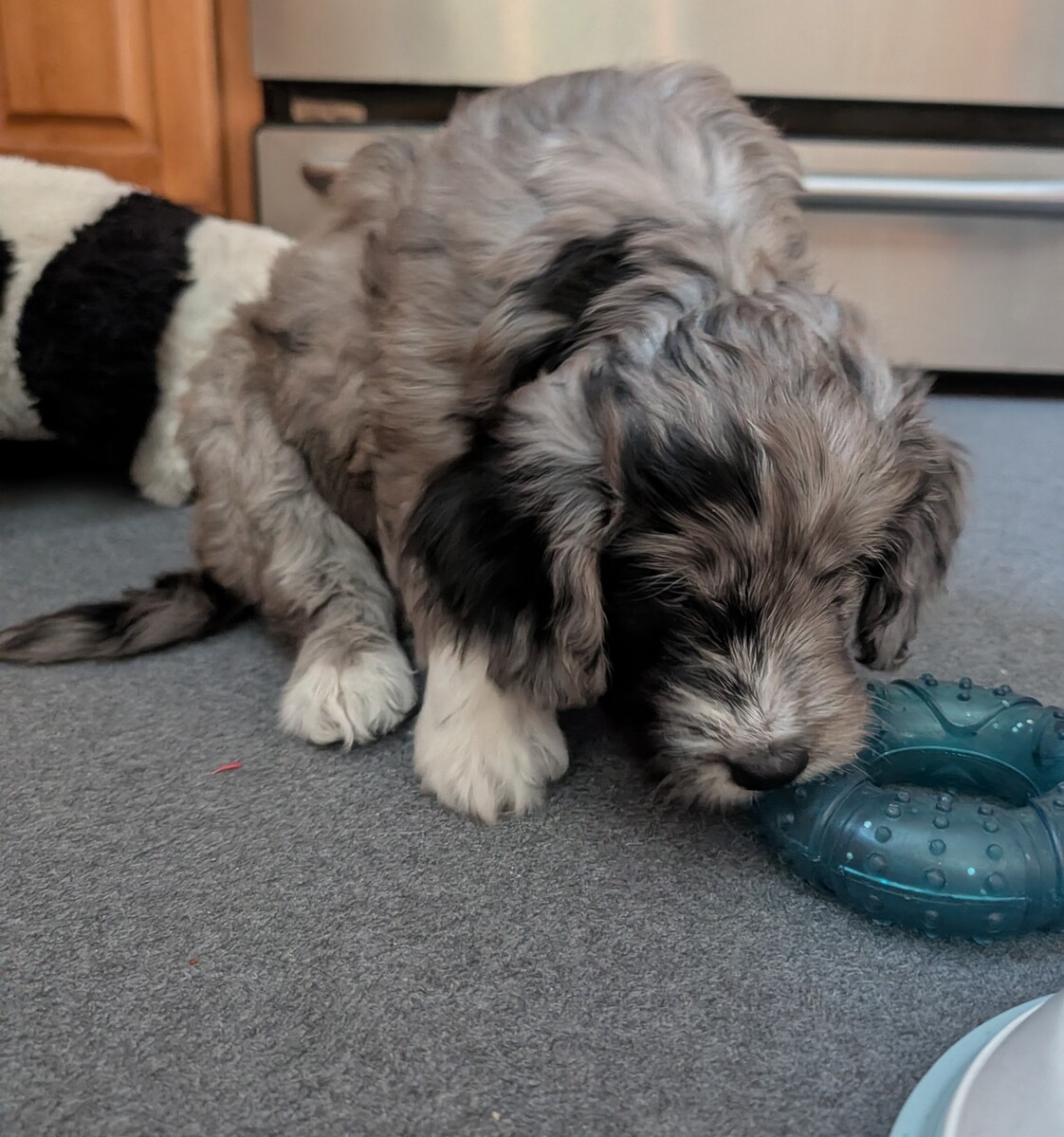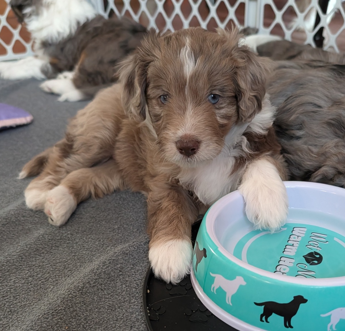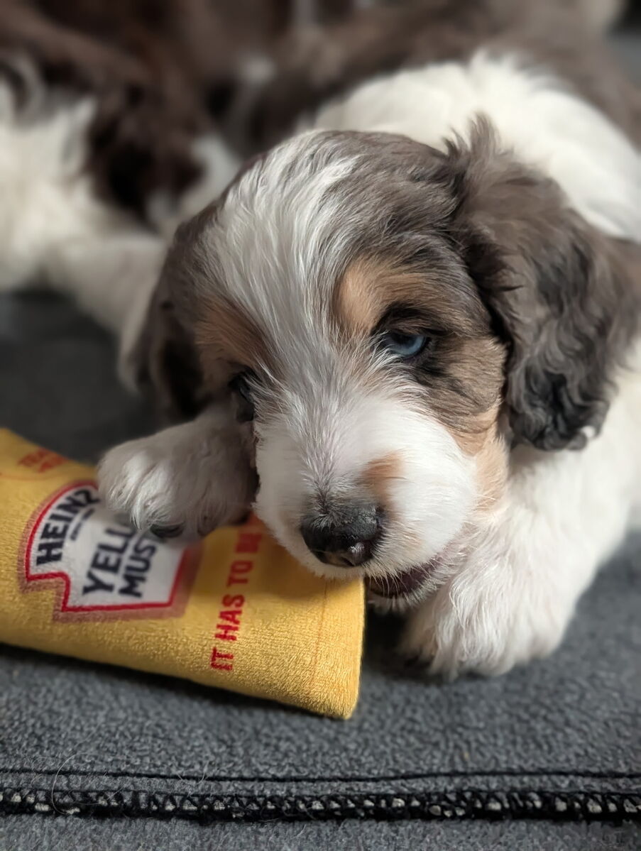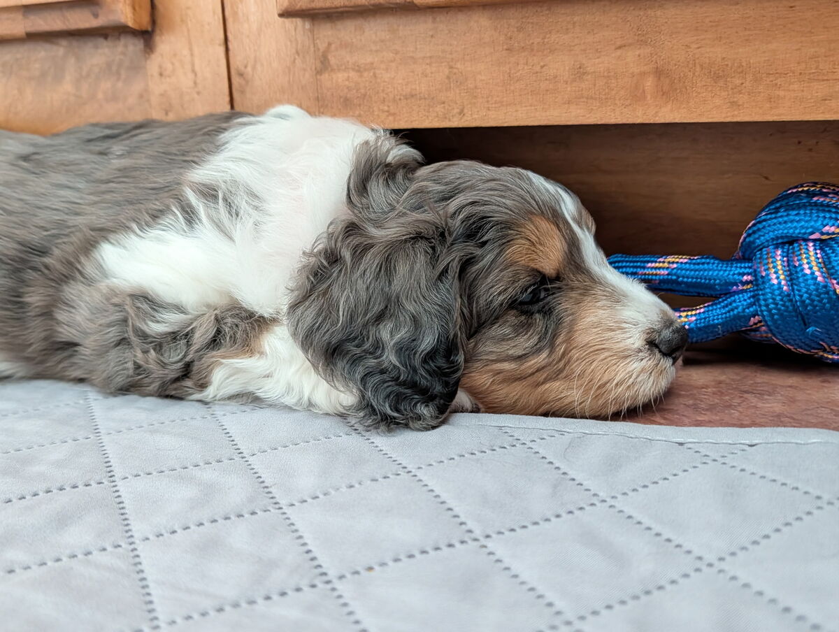 On November 20th, Flicka delivered 7 beautiful, healthy puppies. The litter consisted of 4 girls and 3 boys. Coat colors include Red Merle, Blue Merle, and Chocolate Mantle. While coat colors will vary as they get older, each puppy has their own unique markings.