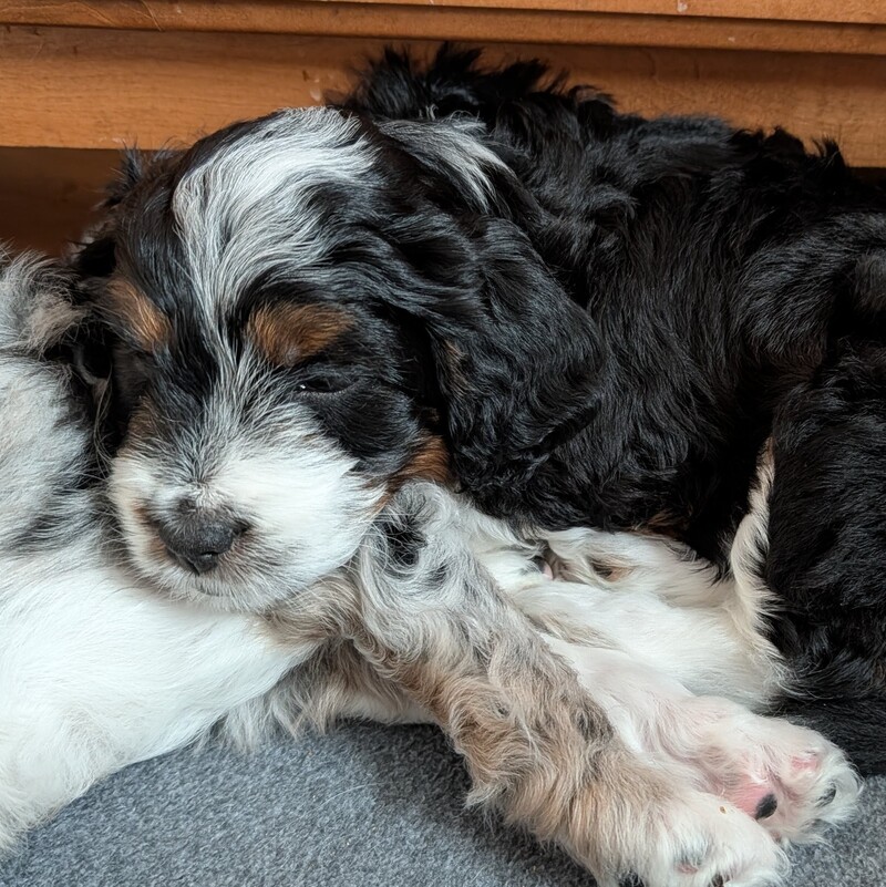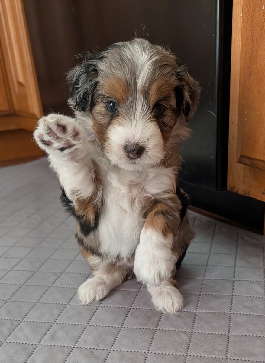 On November 24th, Sierra delivered 8 beautiful, healthy puppies. The litter consisted of 4 girls and 4 boys. Coat colors include Black Tri and variations of Blue Merle. While coat colors will vary as they get older, each puppy has their own unique markings.